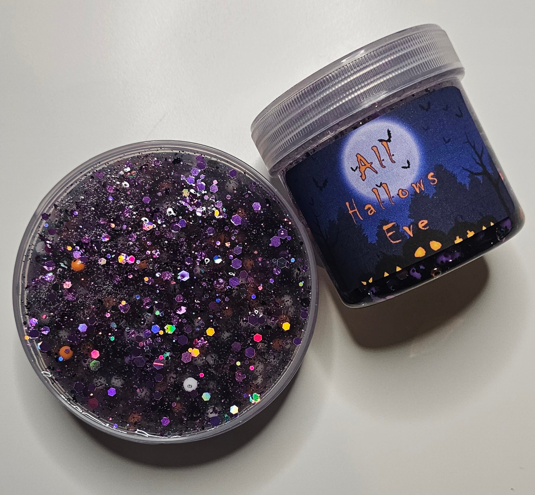 A clear slime with black, purple, orange and white beads, black microbeads and purple and black chunky holographic glitter